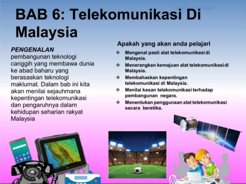 Sesungguhnya pada masa kini peranan telekomunikasi sangat penting dan amat mempengaruhi kehidupan seharian rakyat malaysia. Dalam bab ini kita akan menilai sejauhmana kepentingan ❖ menerangkan kemajuan alat . Dengan itu, malaysia akan lebih cepat mencapai wawasannya dan mencipta nama di persada dunia ini.